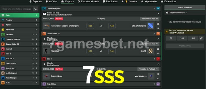 O 7sss oferece uma grande seleção de opções de apostas em e-sports com probabilidades competitivas